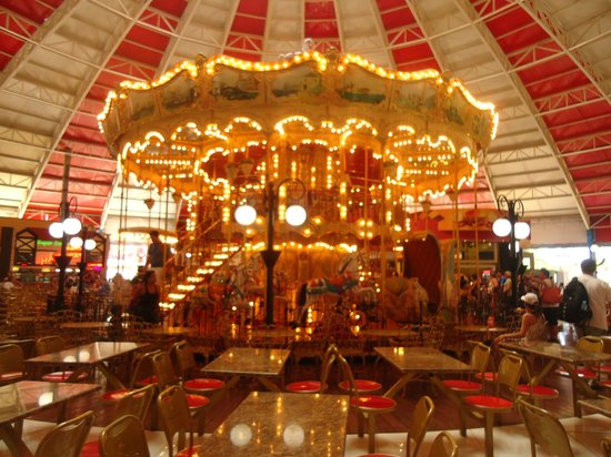 Há opções de restaurantes para todos os gostos, desde os snacks, com sanduíches, pizzas e salgados, passando por massas, comida chinesa, churrascaria ou buffets livres. A Praça de alimentação é bem grande, com muitas opções. Parece praça de alimentação de shopping, com o mesmo tipo de oferta, confusão e barulho.  Mas para contrabalançar, tem um Carrossel Veneziano no meio que é bem bonito. Vale dar uma voltinha com os pequenos. Nem que você dê uma passada por lá só para isso. Os preços não são baratos: em torno de R$30, sem bebida.