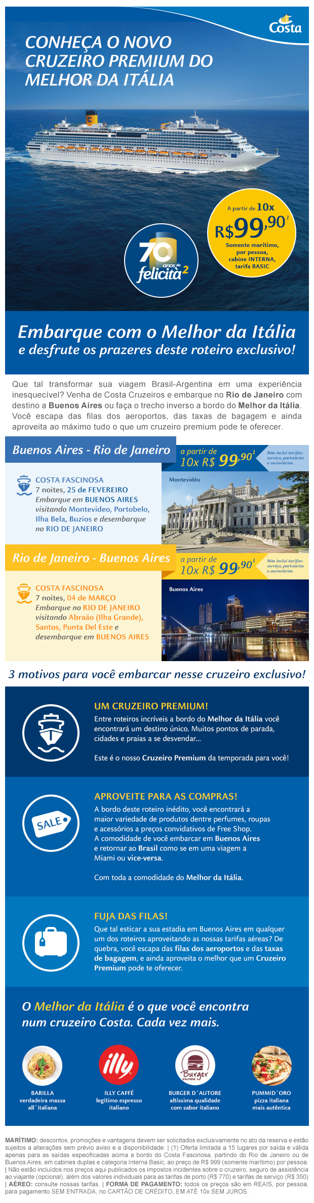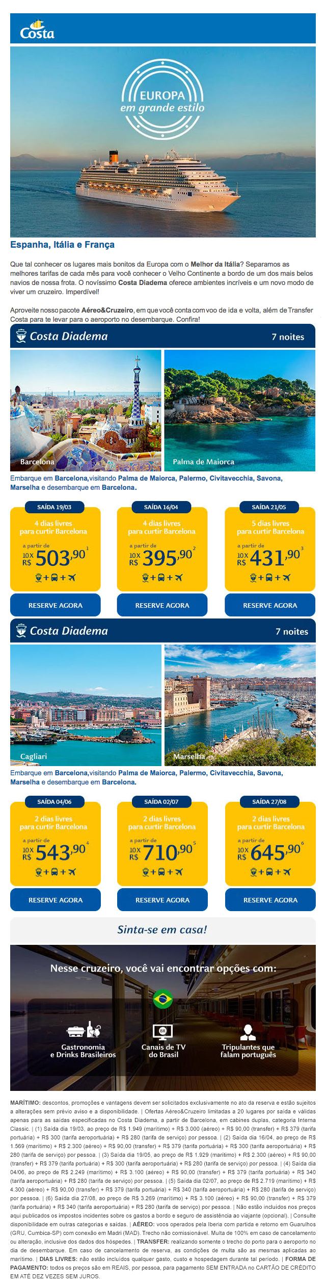 De bandeira italiana, a Costa Cruzeiros oferece conforto e ambientes com design e decoração planejados em todos os detalhes para você só se preocupar em descansar e se divertir. Seja com a família ou amigos, há sempre um ambiente que vai te deixar encantado. Estilo e sofisticação na decoração também não faltam. Rio de Janeiro (RJ), Búzios (RJ), Ilhabela (SP), Angra dos Reis (RJ), Montevidéu (Uruguai), Buenos Aires (Argentina) e travessias Brasil/Europa e Europa/Brasil são alguns dos destinos que os navios vão visitar na temporada 2017/2018.