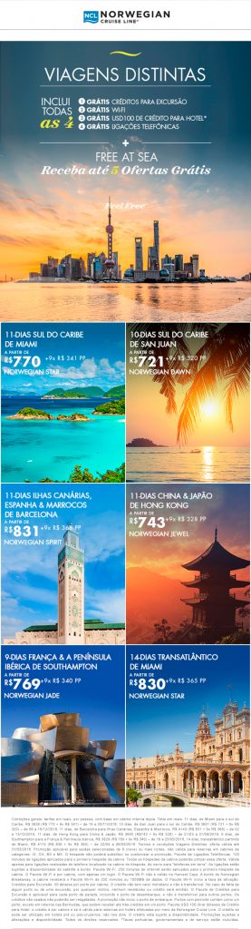 Tecnologia de ponta, sofisticação e qualidade a cada serviço são os grandes diferenciais da MSC Cruzeiros. Os navios da temporada 2017/2018 te levarão para conhecer lugares inesquecíveis como Búzios (RJ), Ilhabela (SP), Salvador (BA), Balneário Camboriú (SC), Punta del Este e Montevidéu (Uruguai), Buenos Aires (Argentina) e travessias Brasil/Europa e Europa/Brasil. Confira!